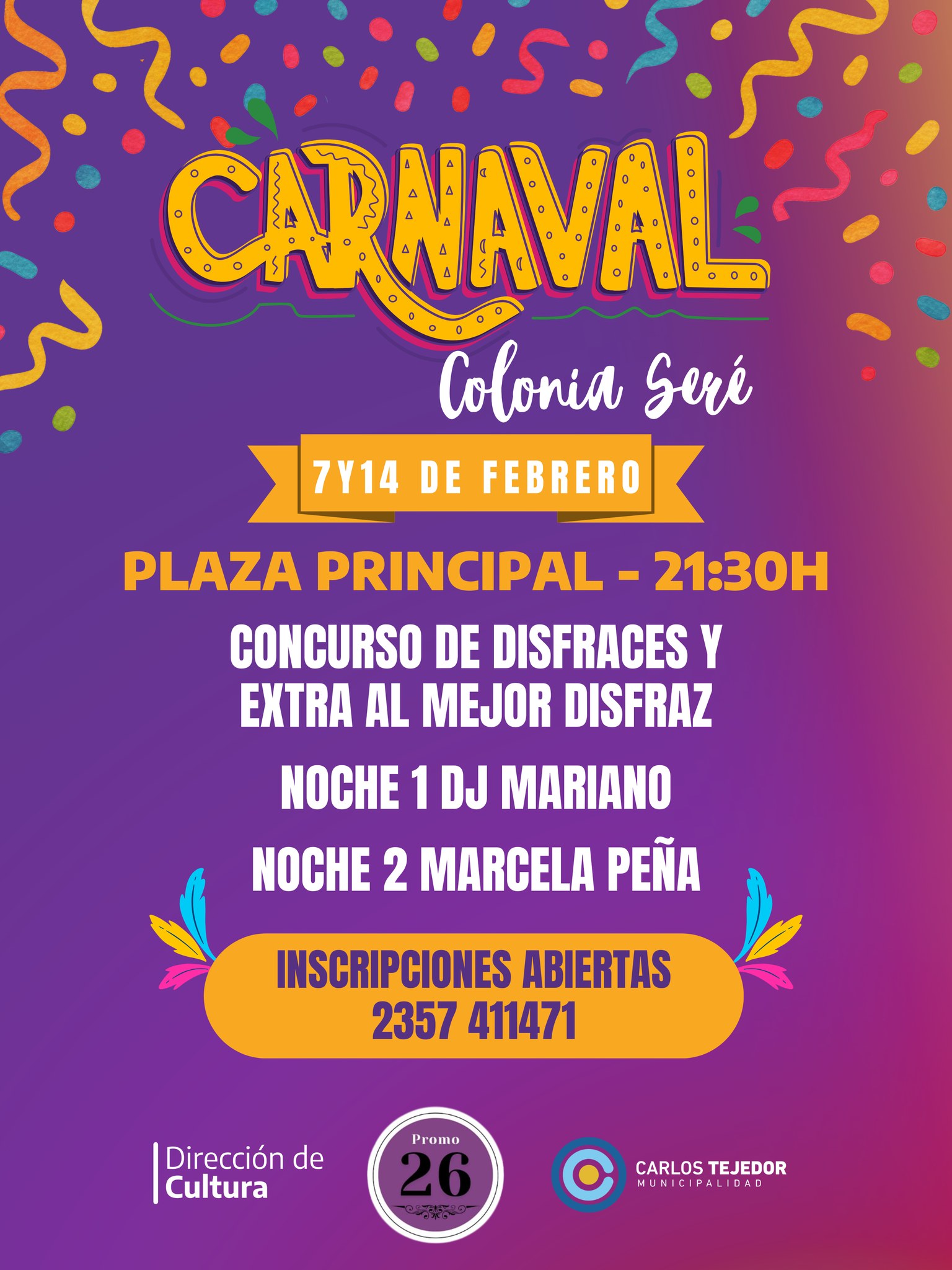 Los sábados 7 y 14 de febrero (2026), a partir de las 21.30hs, se llevarán a cabo los carnavales en Colonia Seré