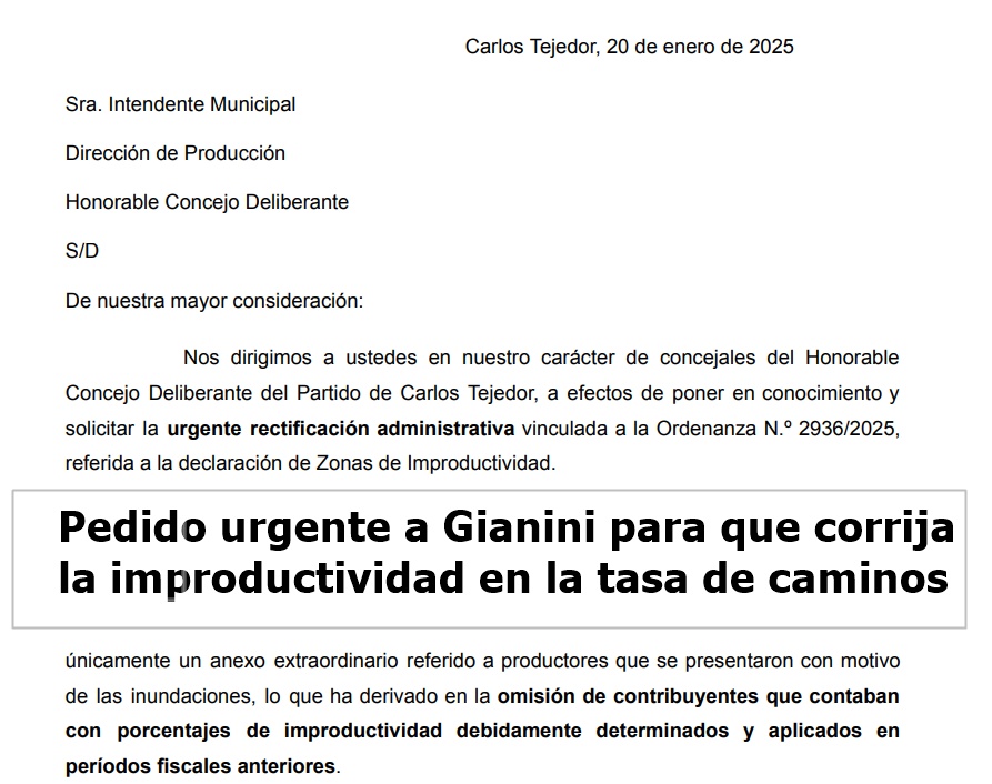 El bloque de Somos (radicalismo) y La Libertad Avanza presentó una nota solicitando a la Intendenta que de manera urgente corrija la liquidación de la tasa de caminos donde no se incluyó la improductividad de los campos, lo que generó que la tasa llegue sin descuentos de entre el 10 y el 90%.