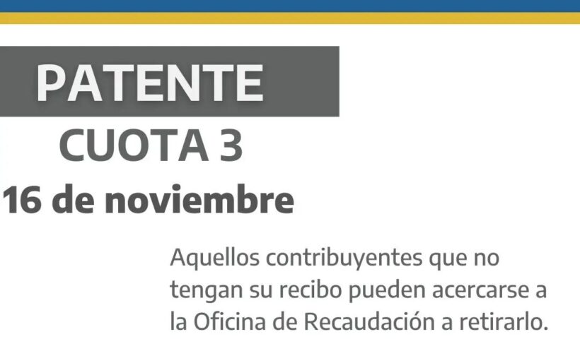 La Municipalidad de Carlos Tejedor informa que el 16 de noviembre (2022) vence la 3° cuota de las patentes municipales. Aquellos contribuyentes que no tengan…